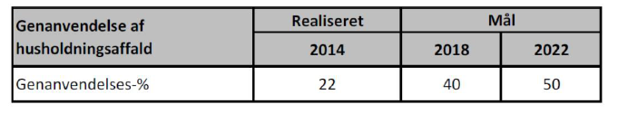 Målet for denne affaldsplan er, at 50 % af husholdningsaffaldet i Tønder Kommune i 2022 skal gå til genanvendelse. Tønder Kommune vil dermed leve op til målsætningen i Ressourceplanen.