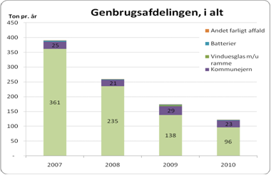 Mængderne fra storskraldsindsamlingen er ikke medregnet i mængderne herunder - her indgår alene de mængder som er registreret modtaget direkte på genbrugsafdelingen og kun affald der er modtaget fra private (ikke erhverv). Mængderne af modtaget materiale er generelt faldende.