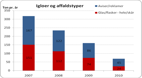 Der er i 2010 indsmalet ca. 70 tons affald via igloerne, størstedelen er pap/papir.