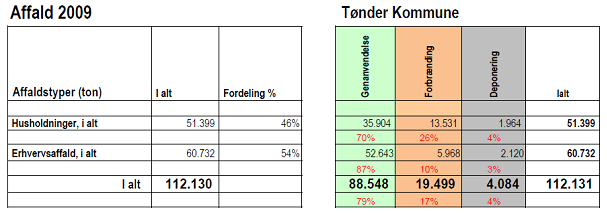 Der er i 2009 registreret i alt 112.000 ton affald, stort set ligeligt fordelt mellem erhverv (54 %) og husholdninger (46 %).