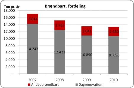 Mængden afforbrændingsgnet affald har været faldende i perioden 2007 - 2009. Fra 2009 til 2010 har mængden af forbrændingsegnet affald været stautus quo.