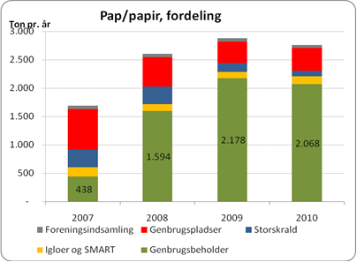Mængden af papir er steget markant (64 %) i perioden fra 2007 til 2009, hvilket først og fremmest skyldes indførelsen af den 2-delte genbrugsbeholder som blev indført i 2008. Der er desuden konstateret et fald i mængderne fra 2009 til 2010, som ikke umiddelbart kan forklares.
