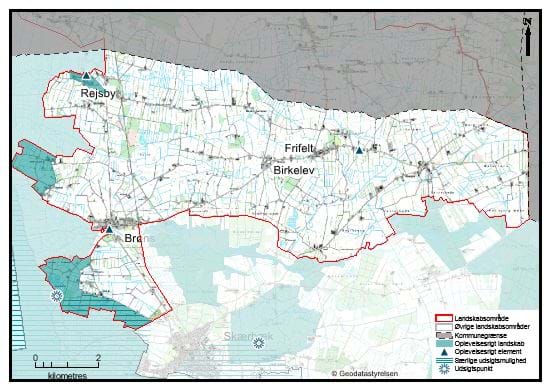 Kirkerne i Rejsby, Brøns og Frifelt er alle tre vurderet som oplevelsesrige kulturhistoriske elementer i landskabet. Kirkerne har alle markant høje kirketårne med spir, hvorved kirkerne rager langt op over det relativt flade landskab omkring kirkerne. Kirkerne ses derfor over store afstande og fungerer på den måde som orienteringspunkter i landskabet.
