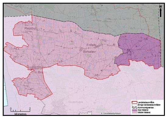 Landbrugslandskabet er generelt præget af strukturudvikling i landbruget. Bebyggelsesstrukturen tegnet af gårde og enkelte husmandssteder er udbygget en del, og strukturer som hegn og diger fra udskiftningen er delvist fjernet. Generelt har strukturudviklingen forstørret landskabets skala og givet landskabet en mere åben karakter. Landskabskarakterernes intakthed vurderes derfor middel.