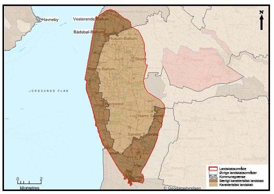 Det øvrige landbrugsområde er vurderet karakteristisk. Her er de bærende landskabstræk forsat et småbakket terræn domineret af landbrug, hegn, plantager, landsbyer og store gårde. Landskabet har dog i kraft af en tættere hegnsstruktur og flere små bevoksninger en noget mere lukket karakter, ofte uden relation til marsken og Vadehavet. Dette ses også i bebyggelsesstrukturen, der afviger fra bebyggelsen i det øvrige landskabsområde. Landskabskarakterens tydelighed vurderes middel.