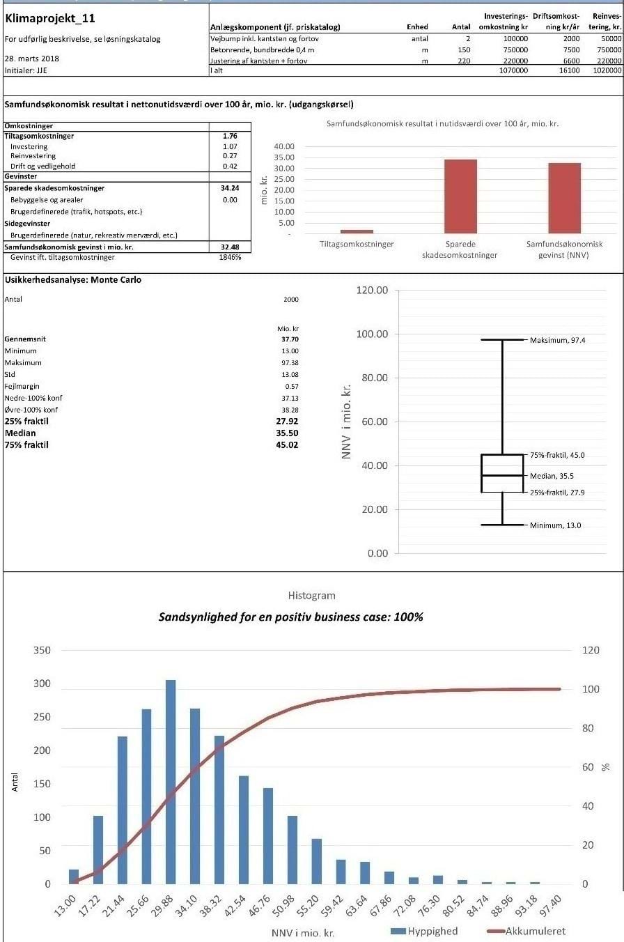 Der findes værktøjer til at gennemføre dette trin. Eksempel på del af resultat/beslutningsgrundlag fra sådan et værktøj er vist på næste side, hvor klimatilpasningstiltaget med fordel kan gennemføres (samfundsøkonomisk gevinst på godt 32 mio. kr.