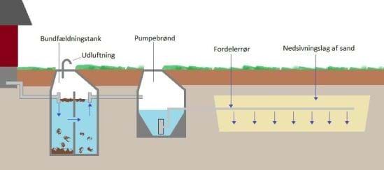 Princippet bag et nedsivningsanlæg fremgår af nedenstående figur.