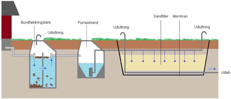 Der stilles ikke særlige miljøbetingede afstandskrav for placering af biologiske sandfilteranlæg. Princippet bag sandfilteranlæg fremgår af nedenstående figur.