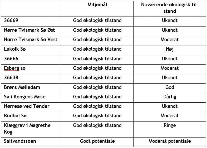 Ifølge MiljøGIS findes der 13 søer i Tønder Kommune, der indgår i Vandområdeplanen. Af disse har de 12 en målsætning om mindst god økologisk kvalitet og 1 har en målsætning om et godt økologisk potentiale. Som det fremgår af nedenstående tabel, har 2 af de 13 søer mindst god økologisk tilstand, mens 5 af søerne ikke har opfyldt målet om mindst god økologisk tilstand. For de resterende 5 søer er tilstanden ukendt. For den sidste sø (Saltvandssøen) er målsætningen om et godt økologisk potentiale ikke opfyldt.