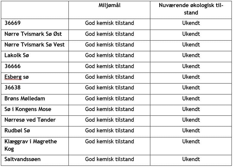 Ifølge MiljøGIS har alle 13 søer en målsætning om god kemisk tilstand og for alle de 13 søer er den nuværende tilstand ukendt.