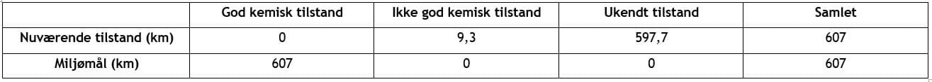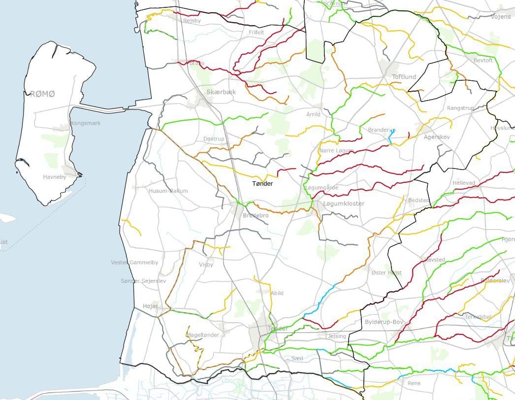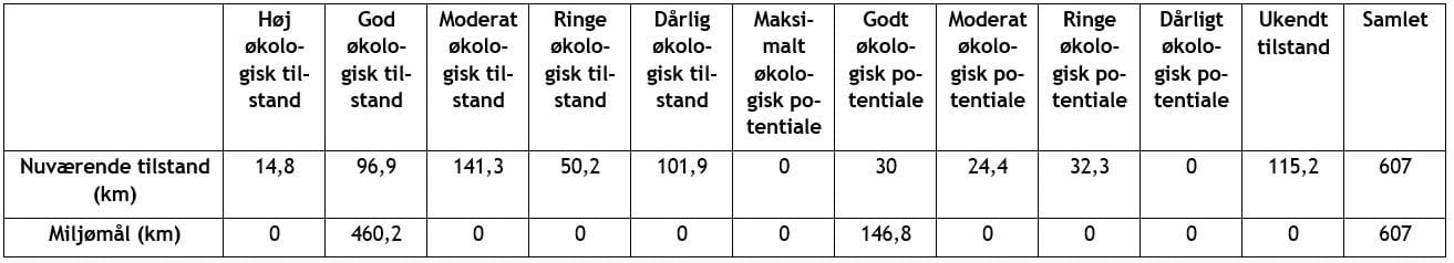 I nedenstående tabel er opgjort antal kilometer vandløb i Tønder Kommune med nuværende faunaindeks samt miljømål for faunaindeks.