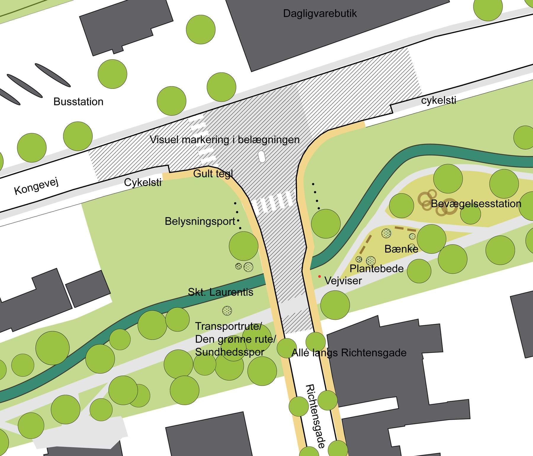 For at understrege porteffekten foreslås opstillet fire lamper på hver side af Richtensgade. Lamperne placeres tæt ved hinanden og vil med deres master illudere en port i dagtimerne, og efter mørkets frembrud vil lyset understrege denne effekt. Med en allé af træer langs Richtensgade understreges porten yderligere.