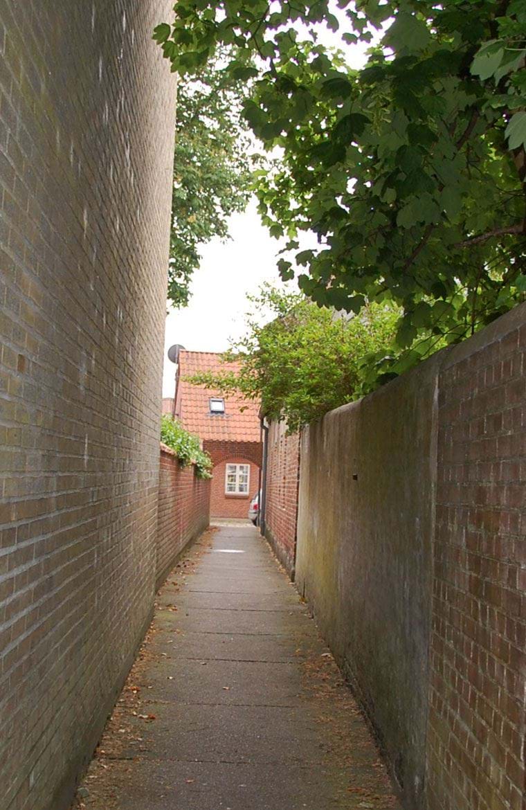 Passager og smøger, der leder til gågaden fra fx de mange parkeringspladser, bør udføres med gule teglsten, så det allerede signaleres i belægningen, hvor den besøgende ledes hen.