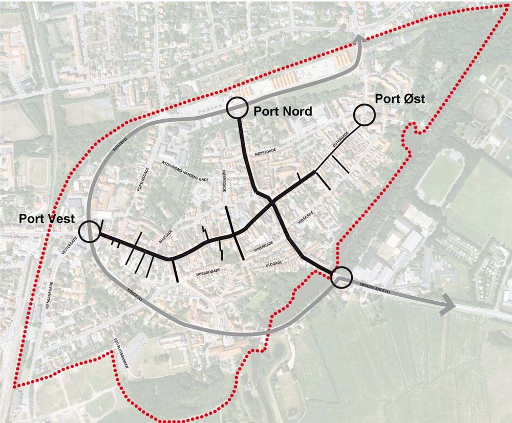 Kort over midtbyens porte – Port Nord, Vest og Øst behandles i Midtbyplanen